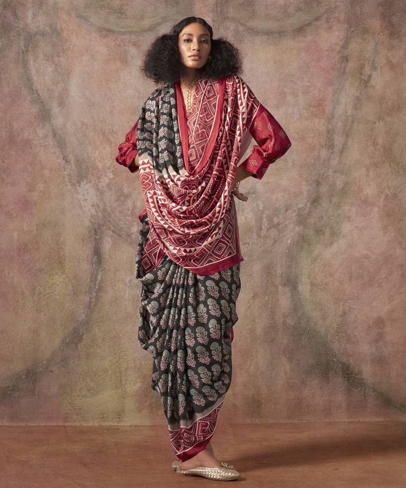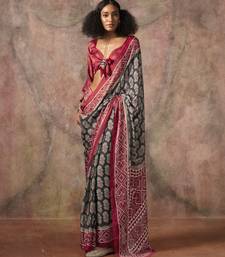 Ajrakh print satin georgette saree with bandhani combination – ethnic fusion elegance