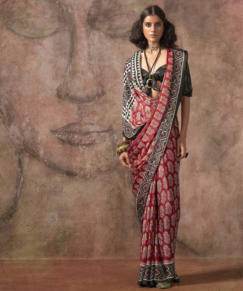 Ajrakh print satin georgette saree with bandhani combination – ethnic fusion elegance