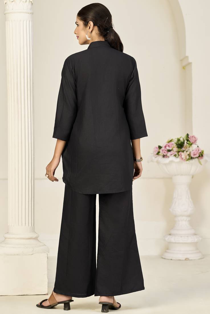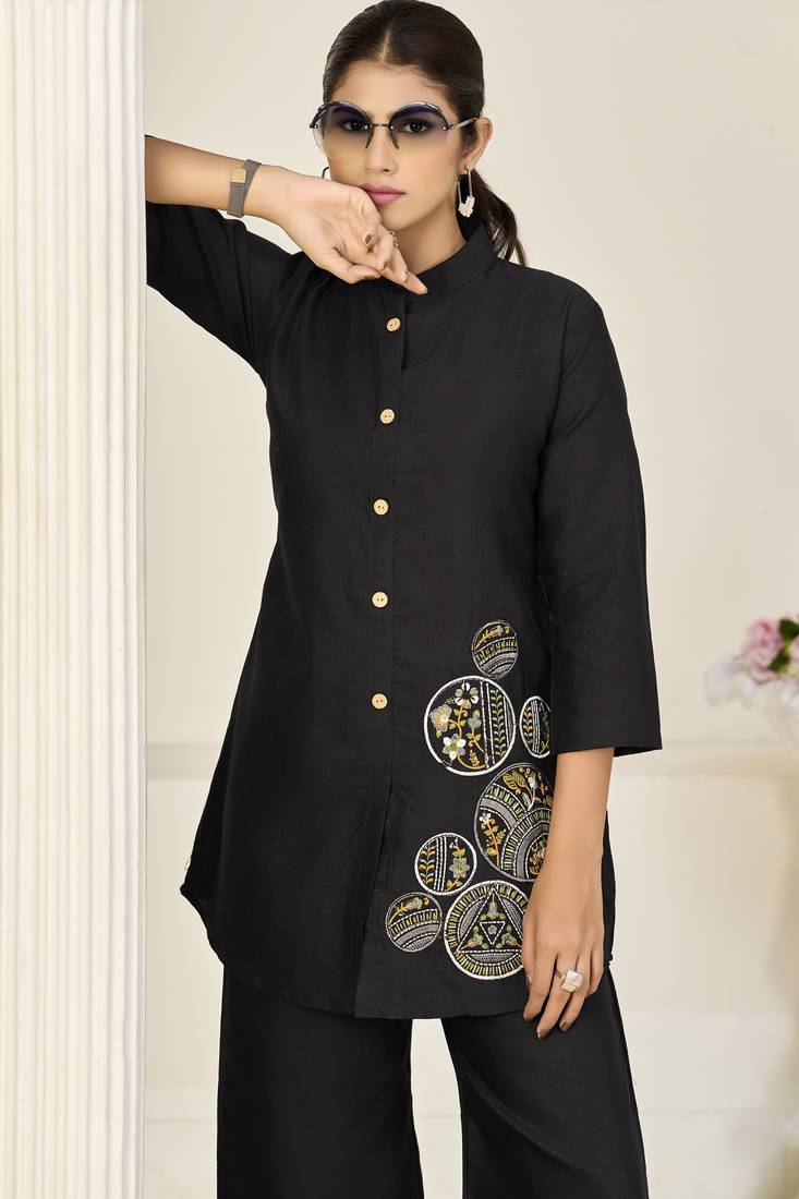 Black elegant reyon slub kurti set with heavy embroidery stitched