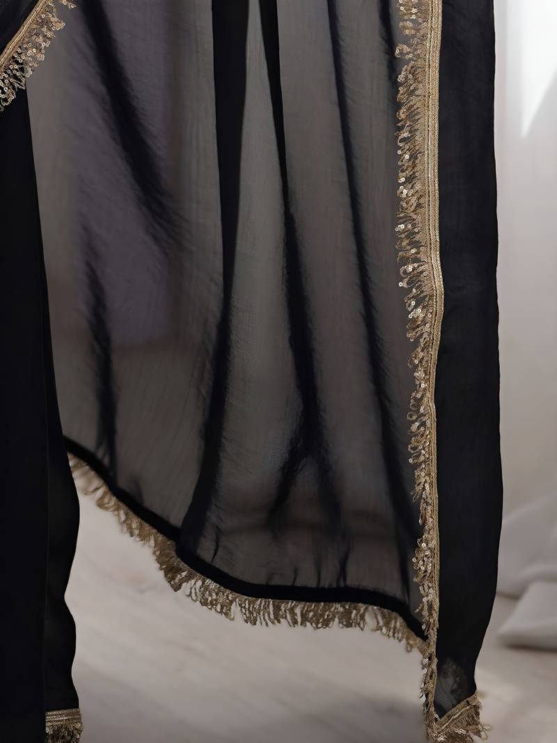 | Product Name | Black Soft Space Silk Saree With Sequin Zalar Lace Border & Matching Blouse | |