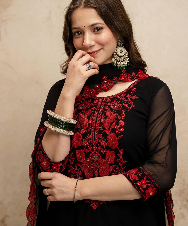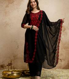 Black women georgette embroidered kurta with embroidered bottom and georgette dupatta set stitched