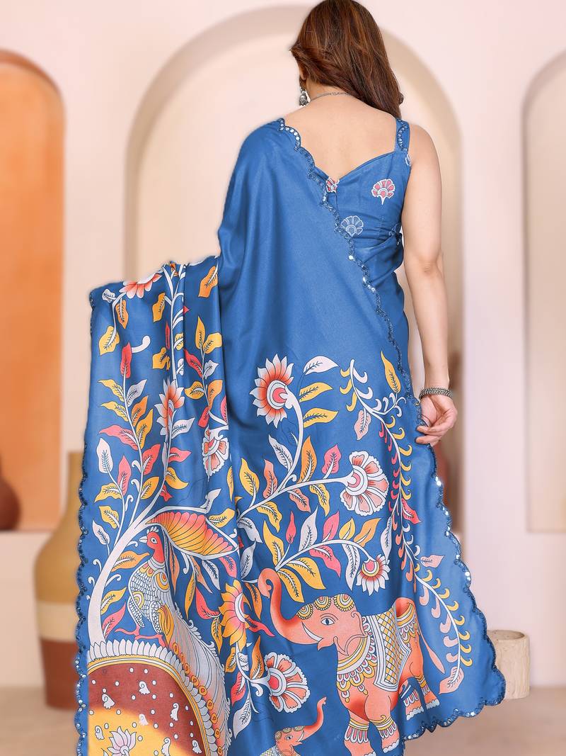 Blue rich manipuri silk kalamkari digital print saree with mirror work border