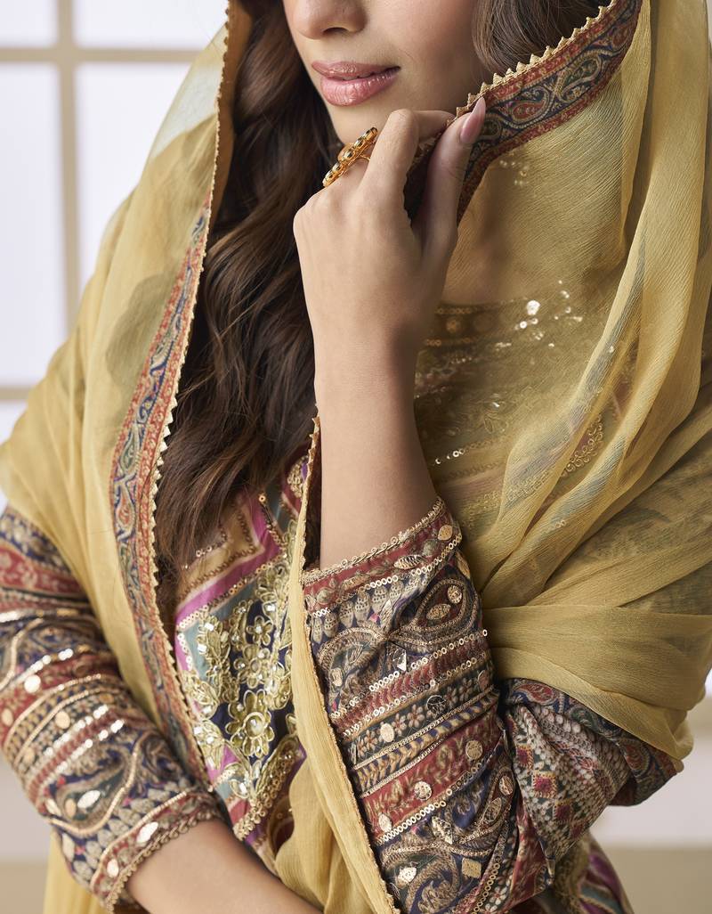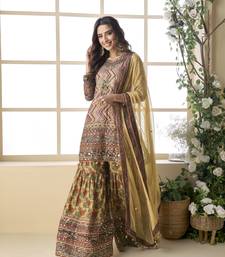 | Product Name | Brown Color Elegant Heavy Crepe Silk Digital Print Suit With Aari Work & Chiffon Dupatta | |