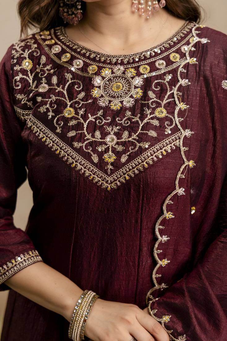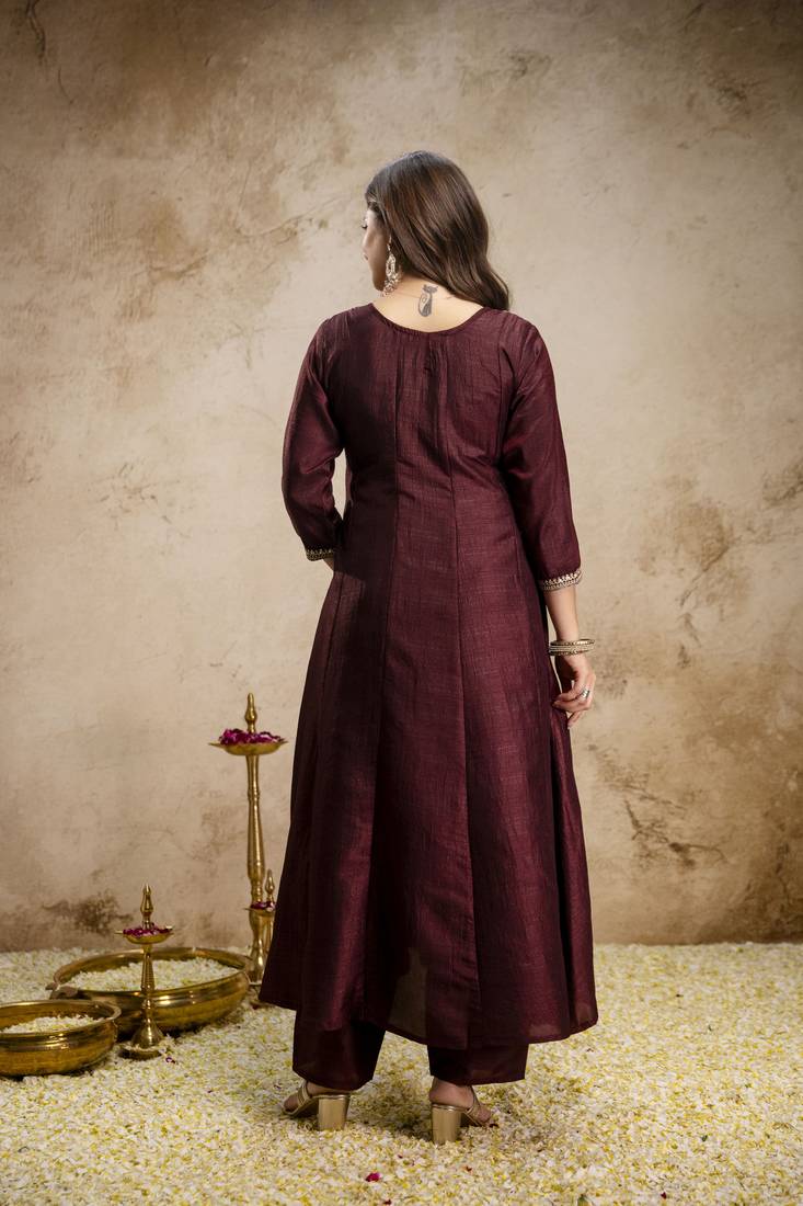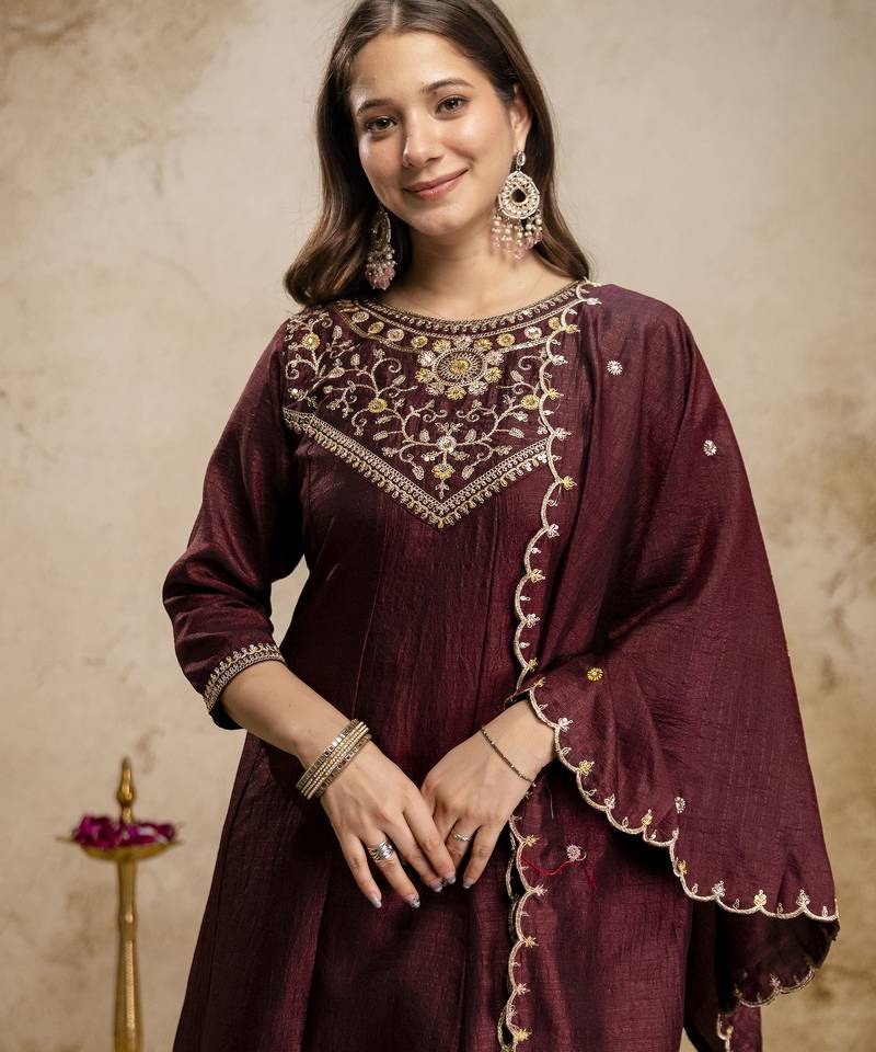 Coffee color women’s embroidered vichitra silk anarkali kurta set with dupatta – flared ethnic suit for festive stitched