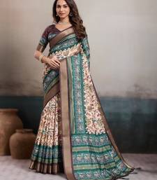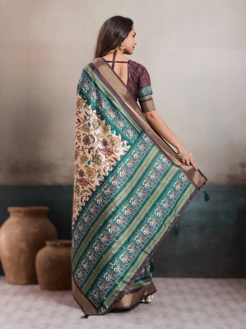 Cream elegant kalki silk digital print saree with unstitched blouse piece