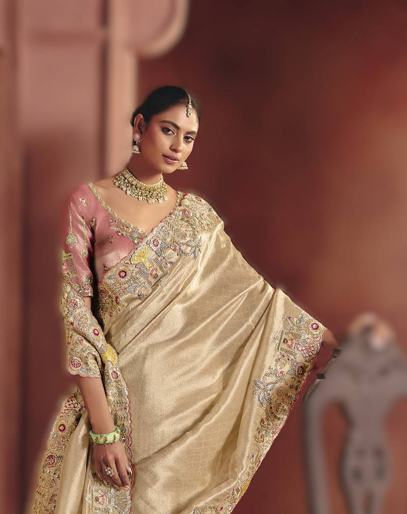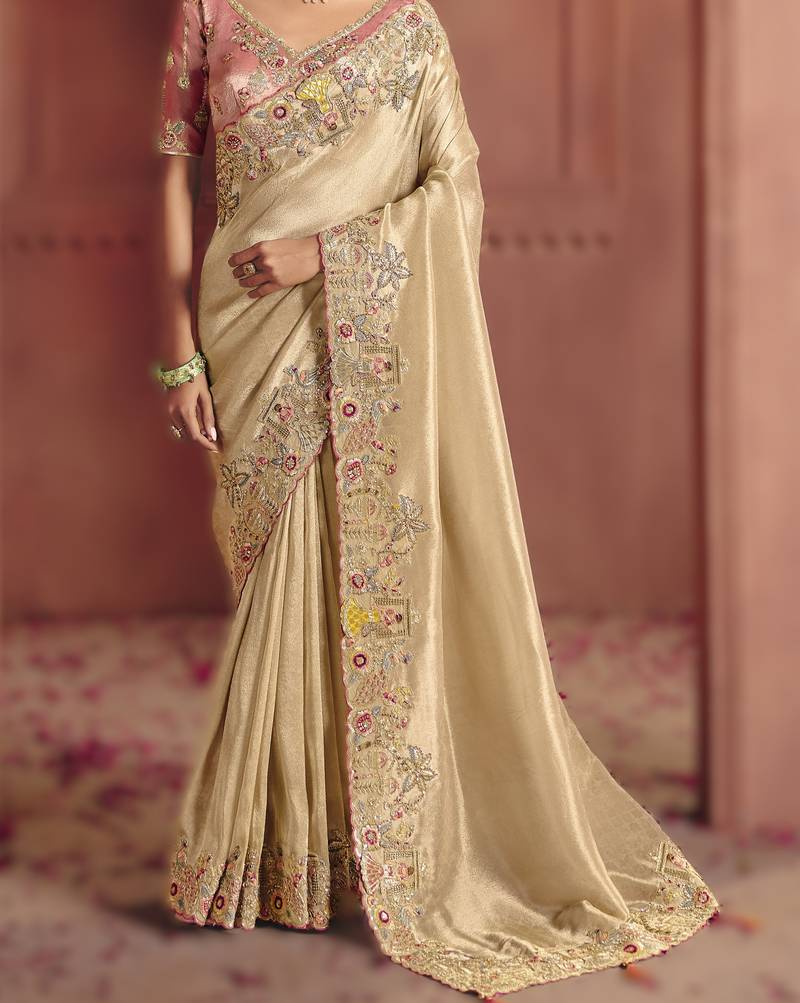 Cream elegant pure smooth zari silk saree with heavy embroidery and sequins