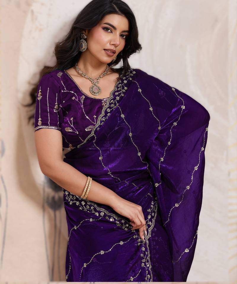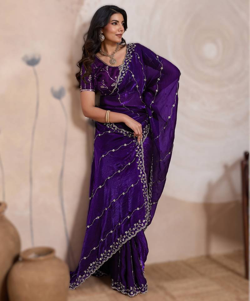 | Embellish | Crafted In Luxurious Metallic Velvet Satin, The Saree Features Intricate Cutdana, Beads, Sequins, And Zari Work Highlighted In A Graceful C Pallu Concept | |
