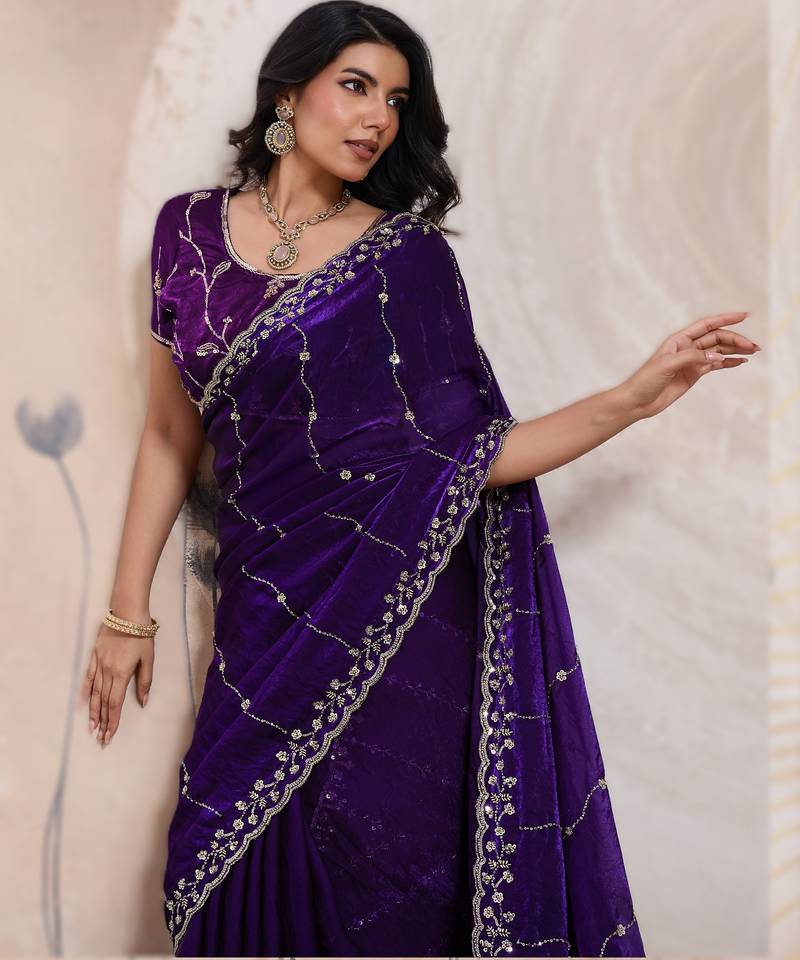 | Product Name | Dark Purple Metallic Velvet Satin Saree With Cutdana, Beads & Zari Work In Emerald Teal | |