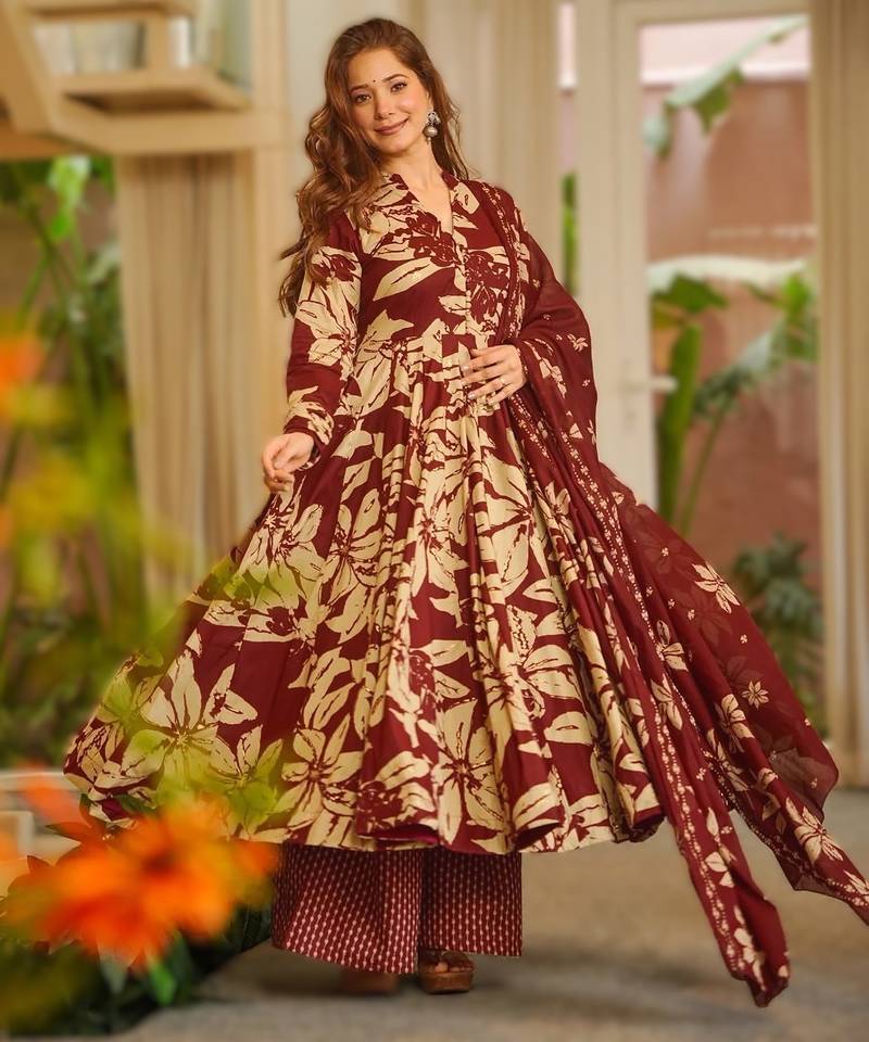 Product Name Dark Red Maslin Heavy Digital Printed Kurta Set With Dupatta | Designer Festival & Party Wear Fully Stitched Suit