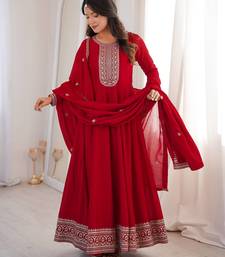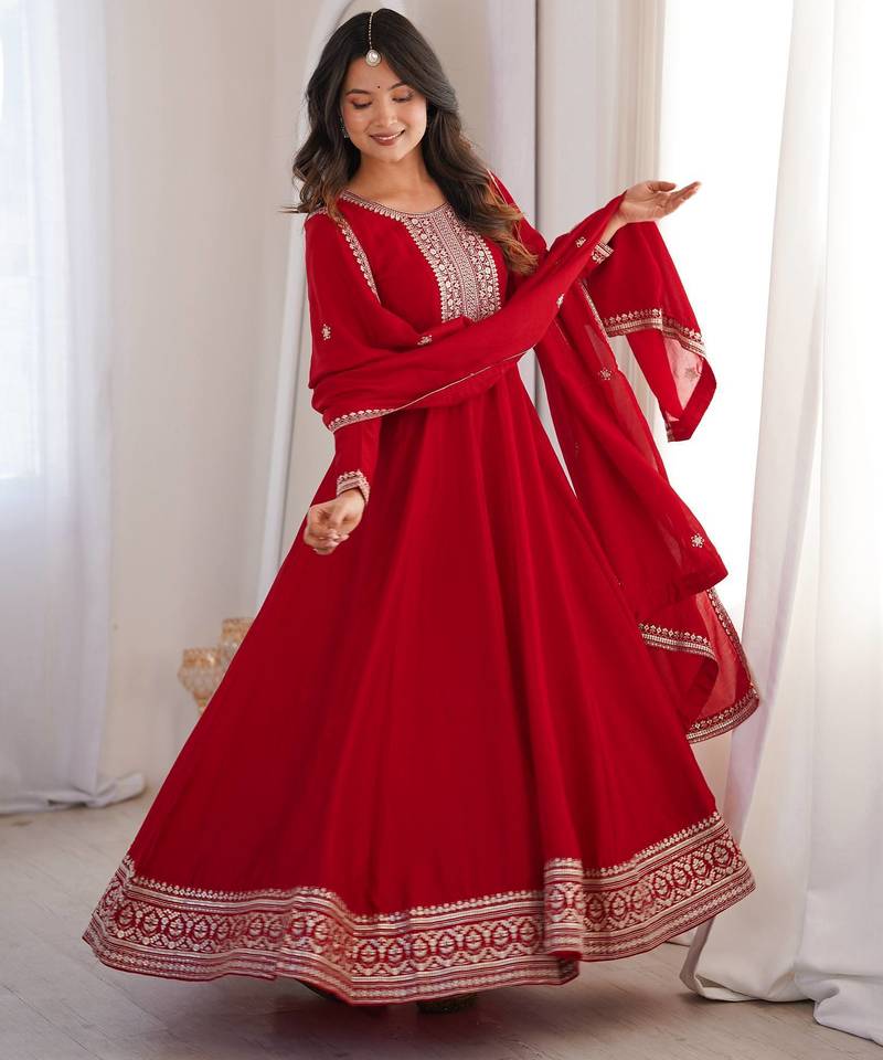 | Product Name | Dark Red Women Heavy Vichitra Silk Anarkali Gown With Embroidery Zari & Sequence Work Dupatta | Fully Flared Party Wear | |
