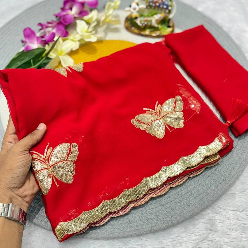 Designer blooming georgette saree with all-over sequins work & peacock–butterfly butta | premium collection