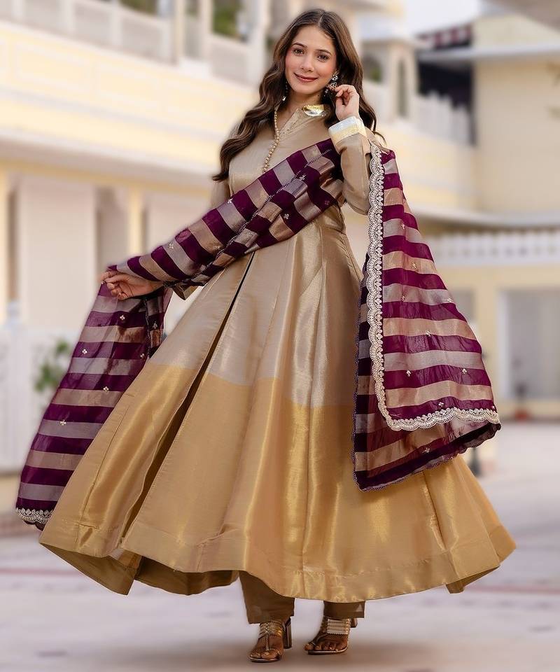 Elegant banarasi gown with dupatta festive flair & timeless grace stitched
