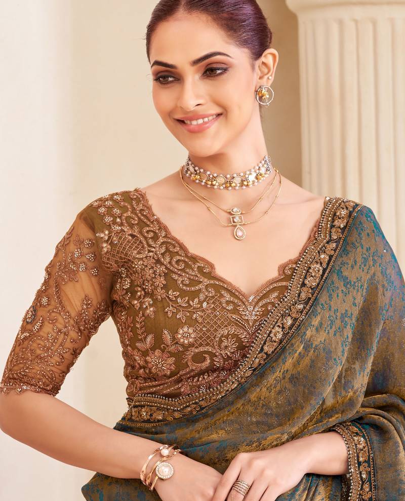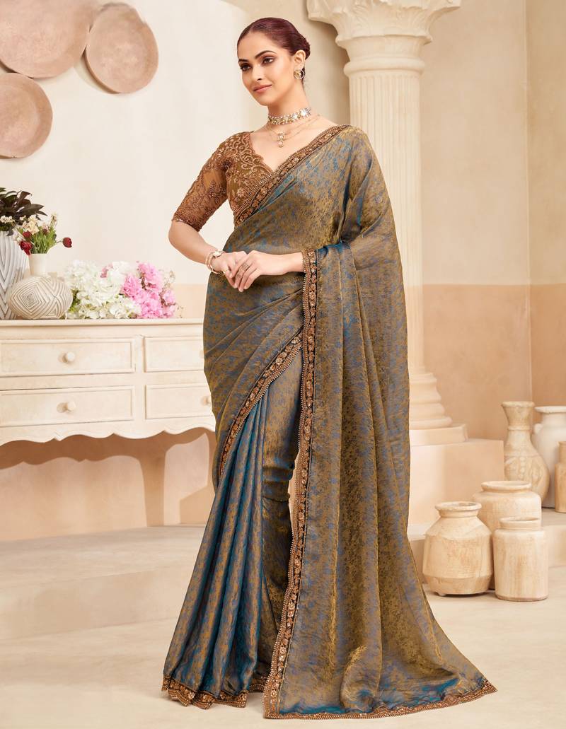 Crafted In Fendi Jacquard, This Saree Offers A Premium Textured Shine. Comes With An Elegant Embroidered Blouse, Suitable For Weddings And Special Events.