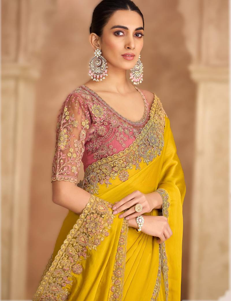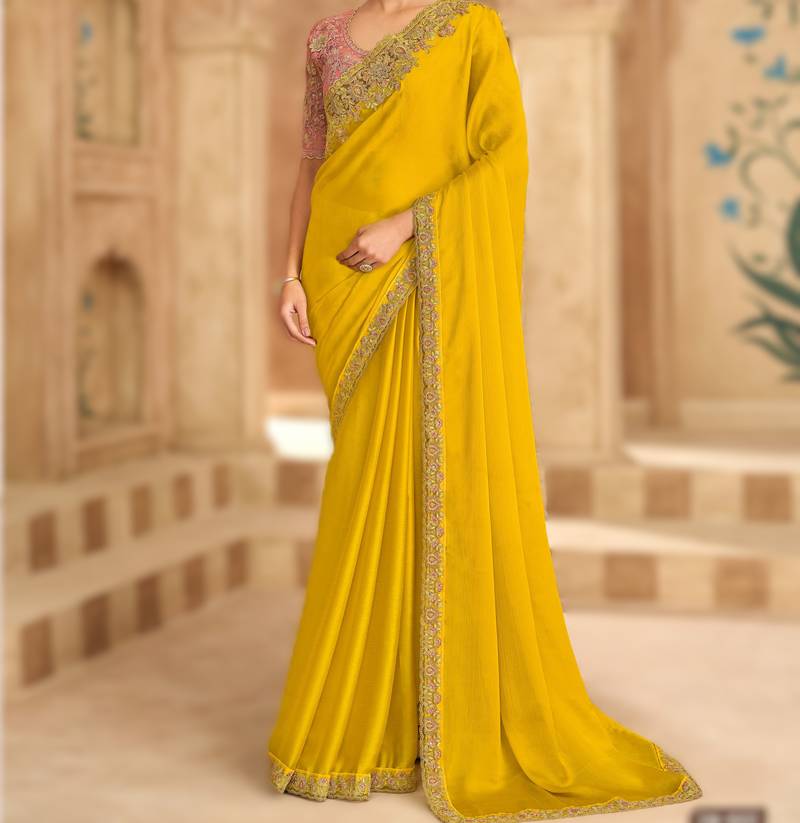 | Embellish | Luxurious Gold Satin Chiffon Saree With A Smooth Texture And Rich Shine. Paired With An Unstitched Banglori Work Blouse, | |