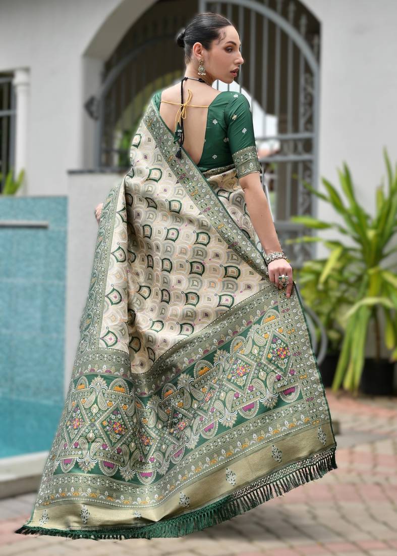 Green banarasi silk saree in ajrakh and patola weaving with zari pallu