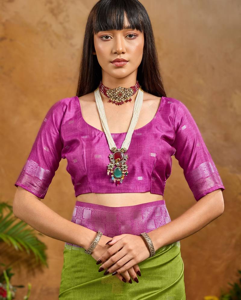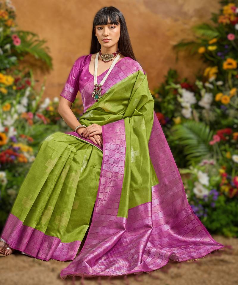 Green handloom weaving paper silk saree with matching paper silk blouse