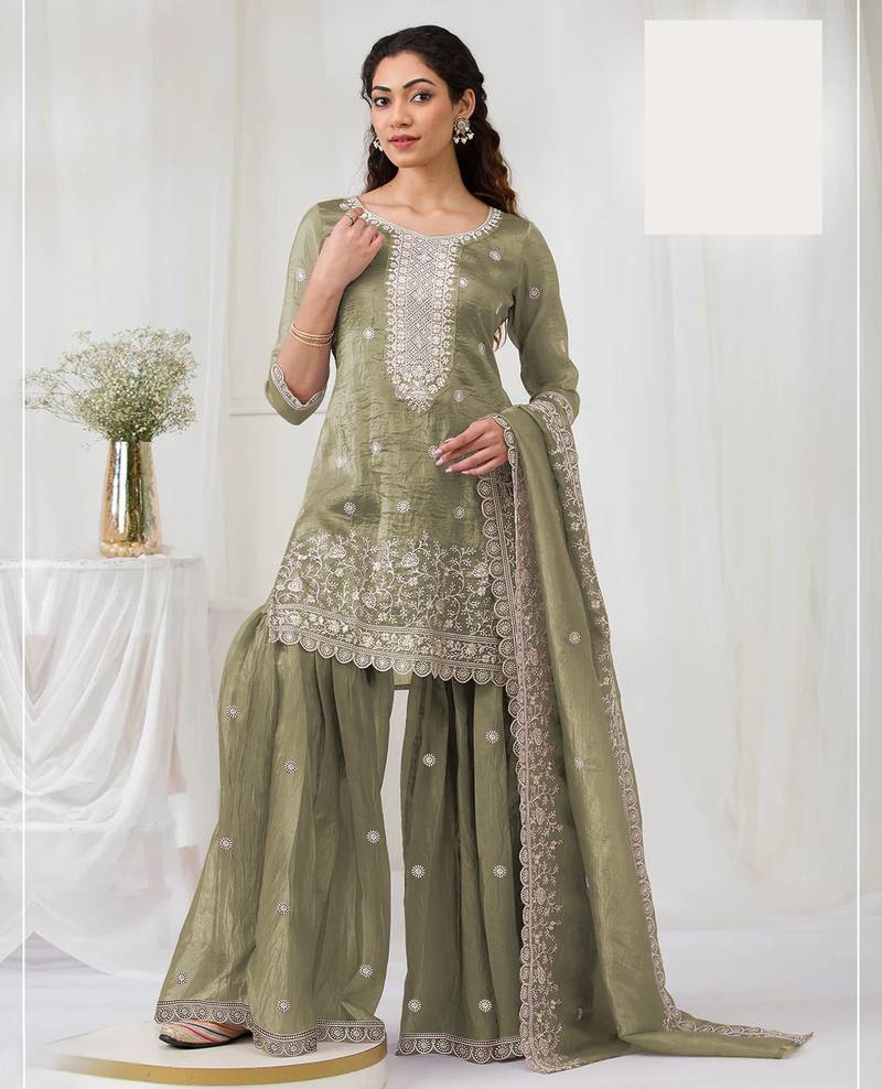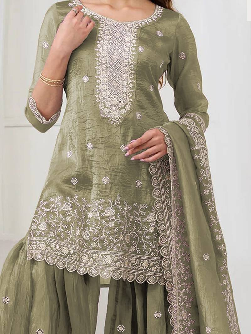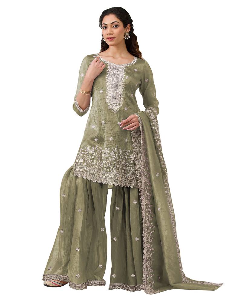 Green embroidered georgette sharara suit stitched