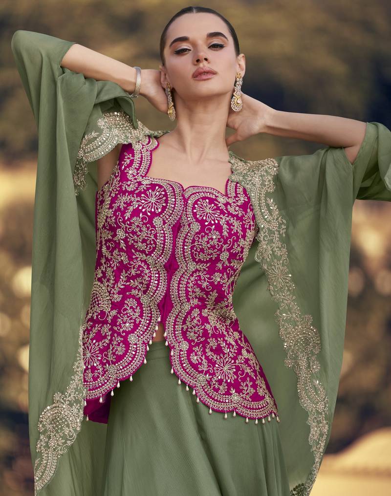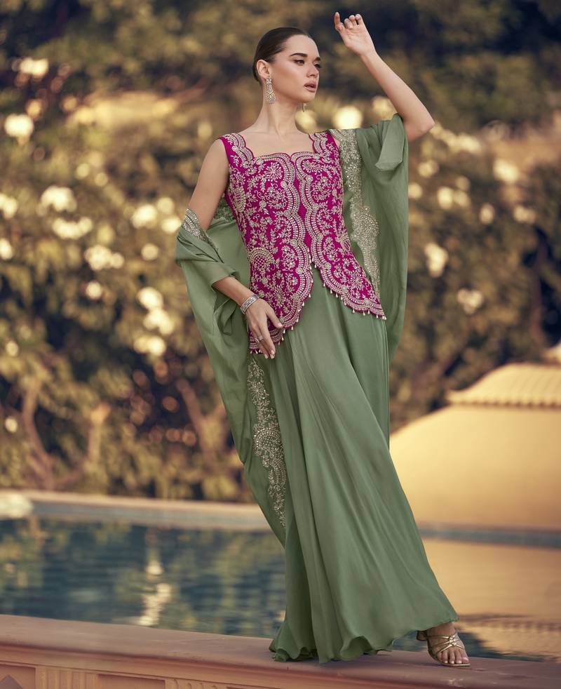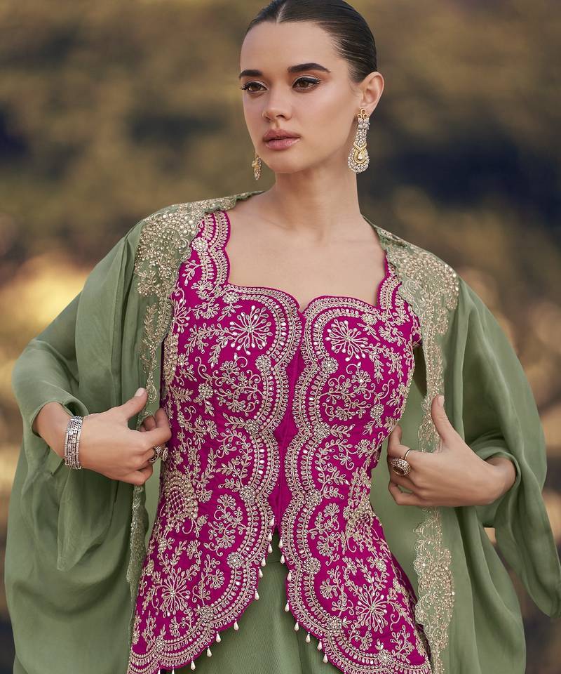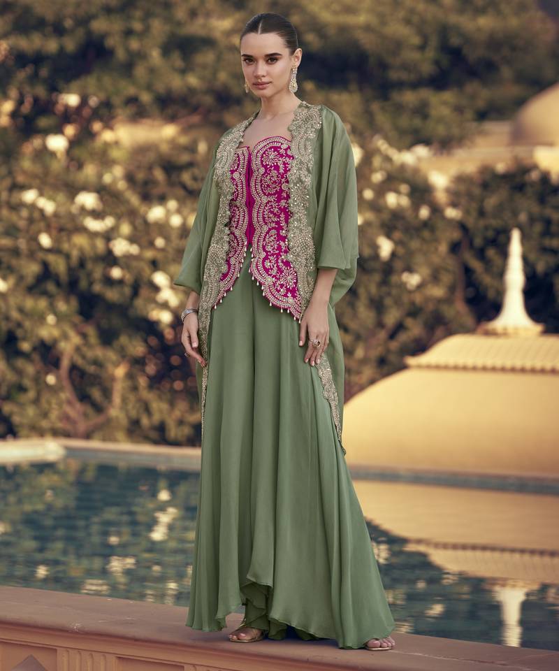 Green chinon with sequins indo western jacket style palazzo suit stitched