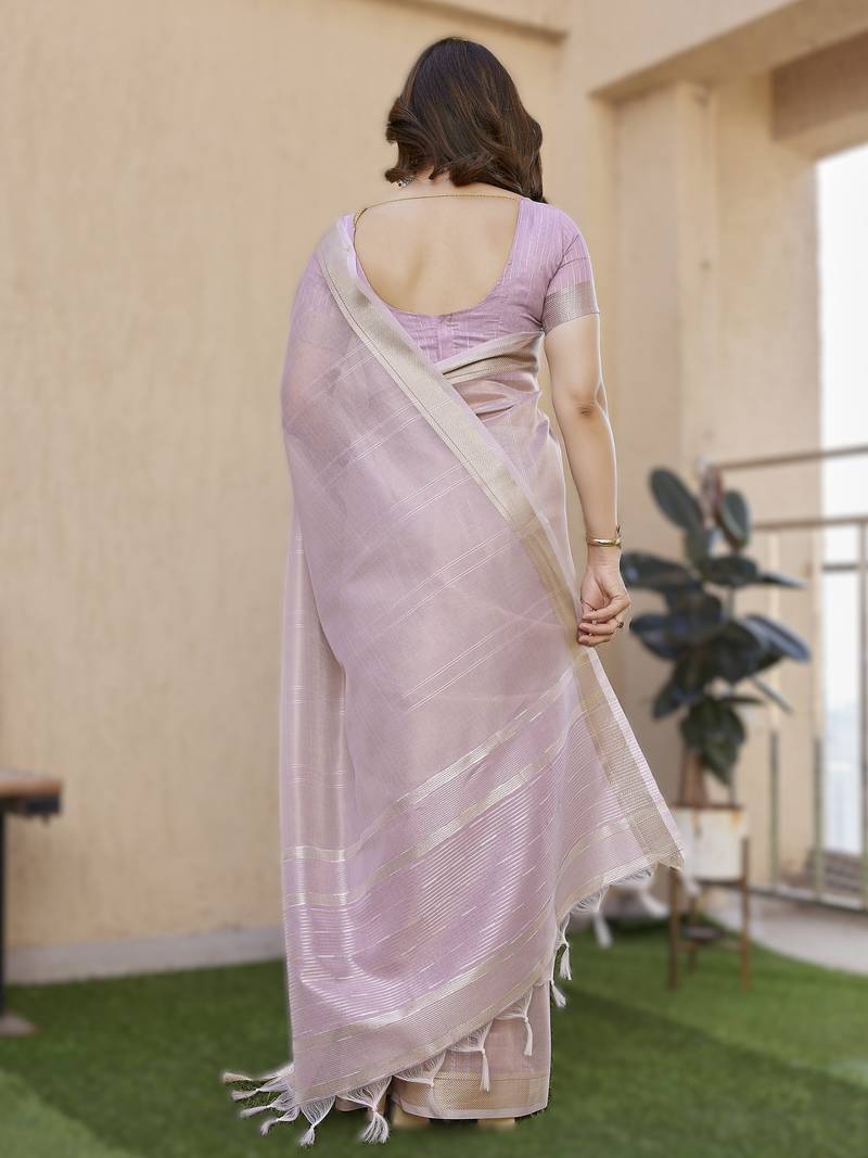 Light purple soft tissue linen silk saree with all-over zari linings & rich zari pallu