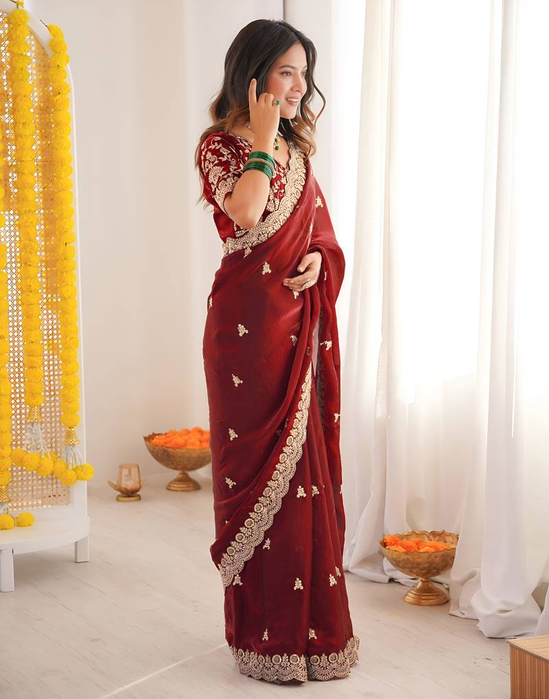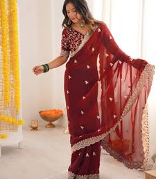 Maroon color designer fandy satin silk saree with sequins embroidery & cutwork border