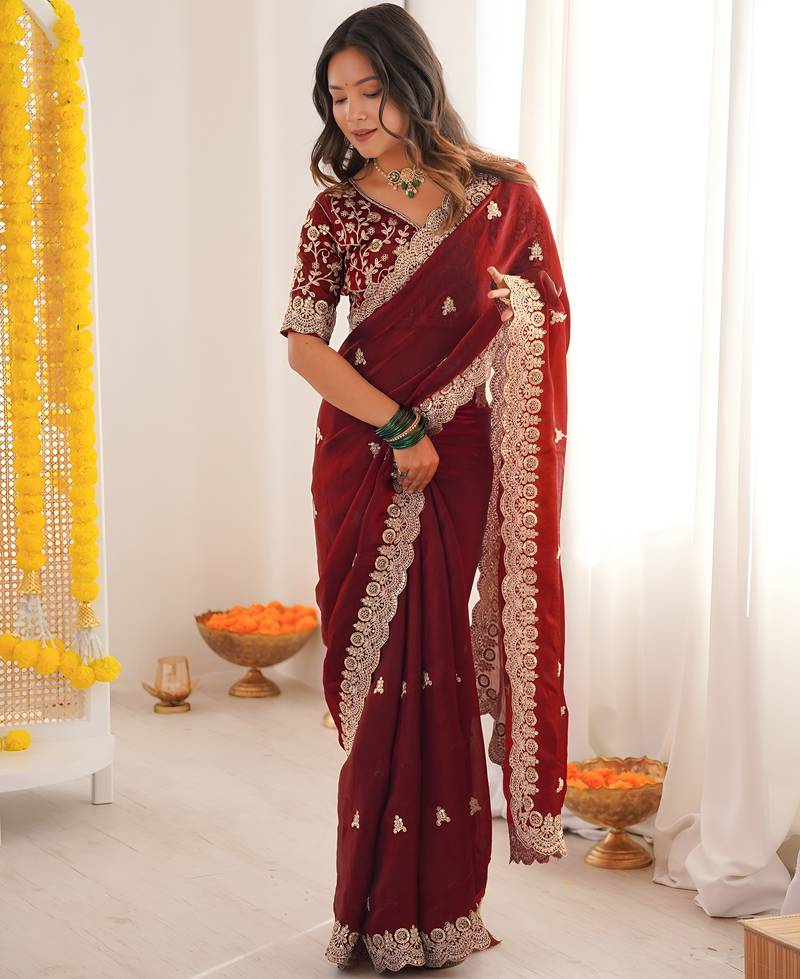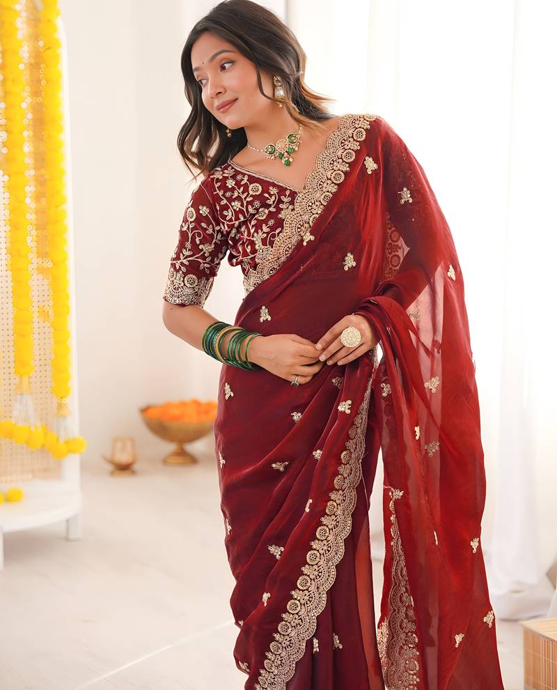 | Product Name | Maroon Color Designer Fandy Satin Silk Saree With Sequins Embroidery & Cutwork Border | |