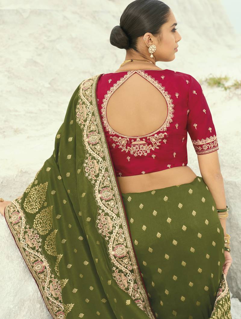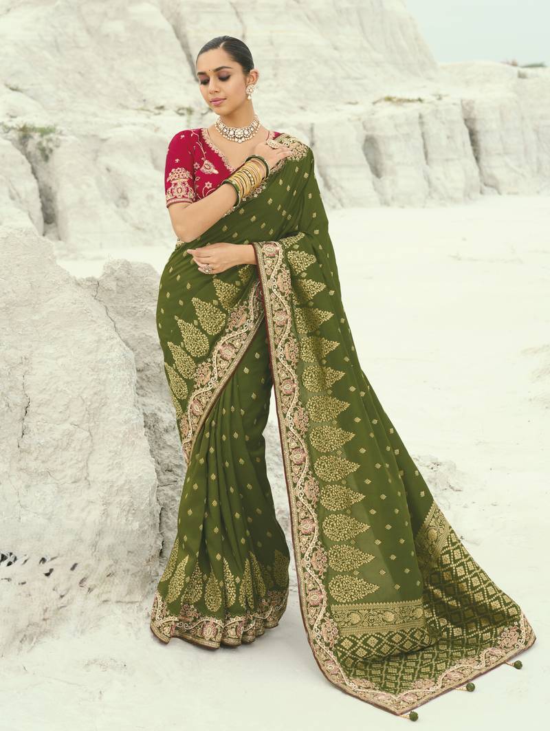 | Product Description | A Mesmerizing Mehandi Pure Dola Viscose Saree Adorned With Intricate Jari, Thread, Moti, And Cut Dana Heavy Work. The Rich Detailing Enhances Its Regal Appeal. Paired With A Pure Silk Blouse, This Saree Is Ideal For Grand Celebrations And Traditional Functions. |