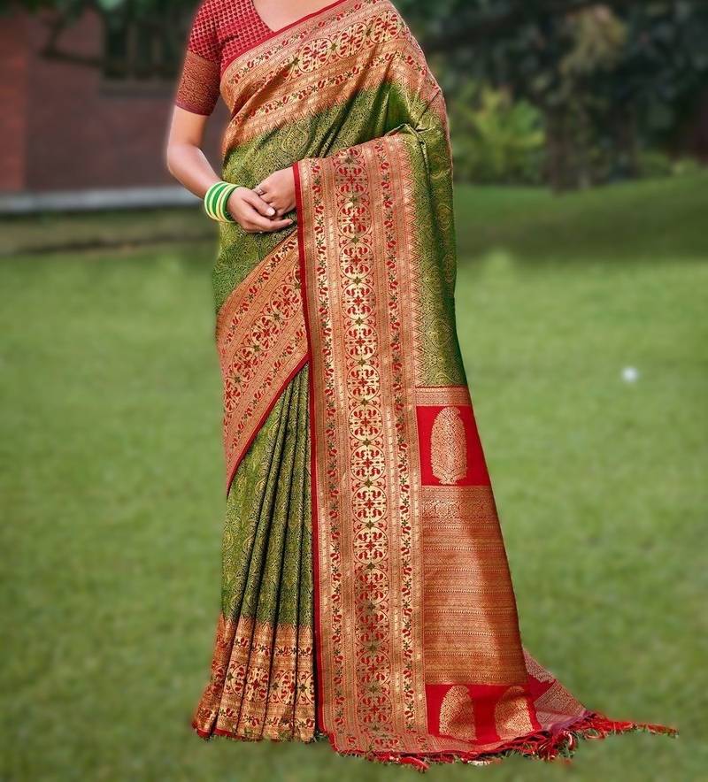 Mehendi new exclusive banarasi silk saree with unstitched blouse piece