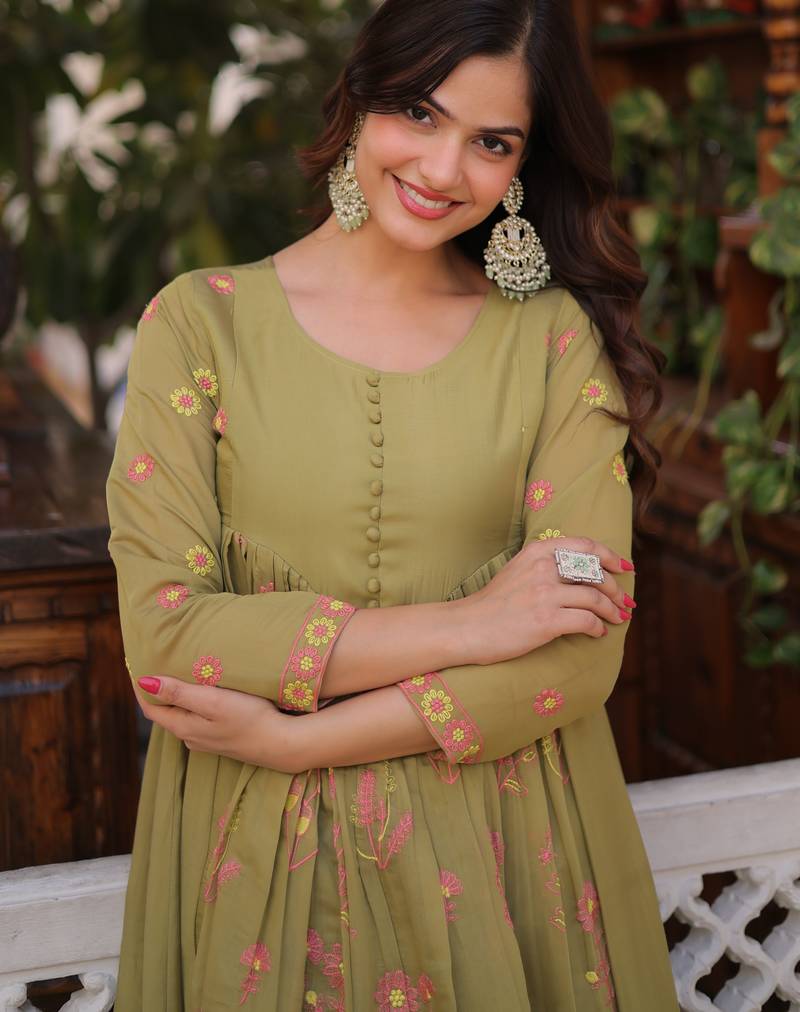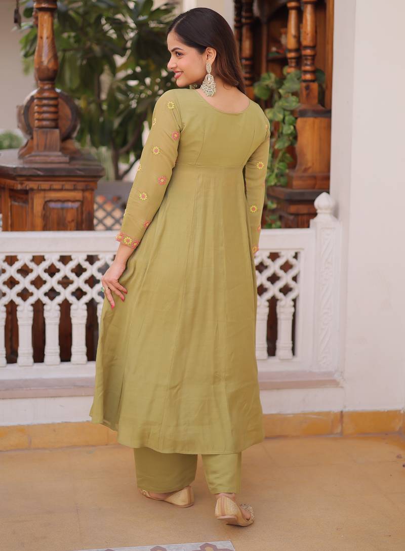 Mehendi women mal chanderi embroidered kurti with roman silk pant set stitched