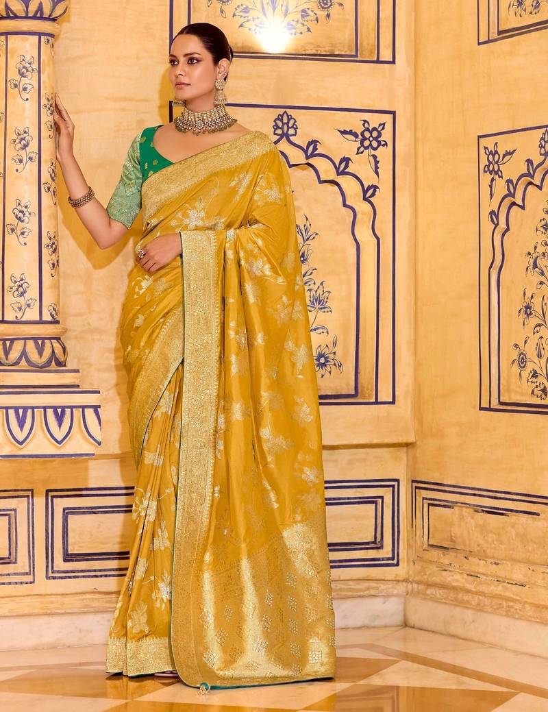 Mustard yellow color premium crepe silk blend saree with rich zari weaving | elegant party & festive wear
