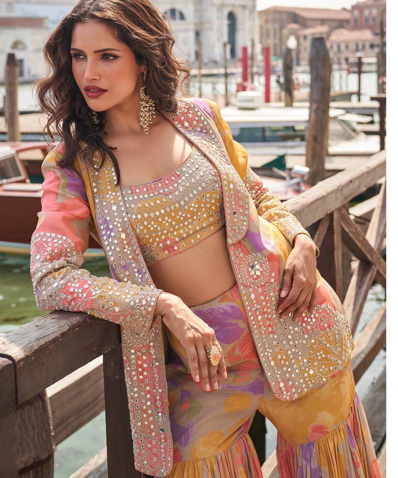Step Into Elegance With This Premium Designer Gharara Set Crafted From Rich Chinon Silk And Georgette Fabrics. Featuring Beautiful Digital Prints Enhanced With Sequins And Mirror Work, This Outfit Is Perfect For Festive Occasions, Weddings, And Traditional Celebrations.