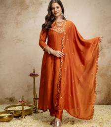 Orange color women’s embroidered vichitra silk anarkali kurta set with dupatta – flared ethnic suit for festive stitched