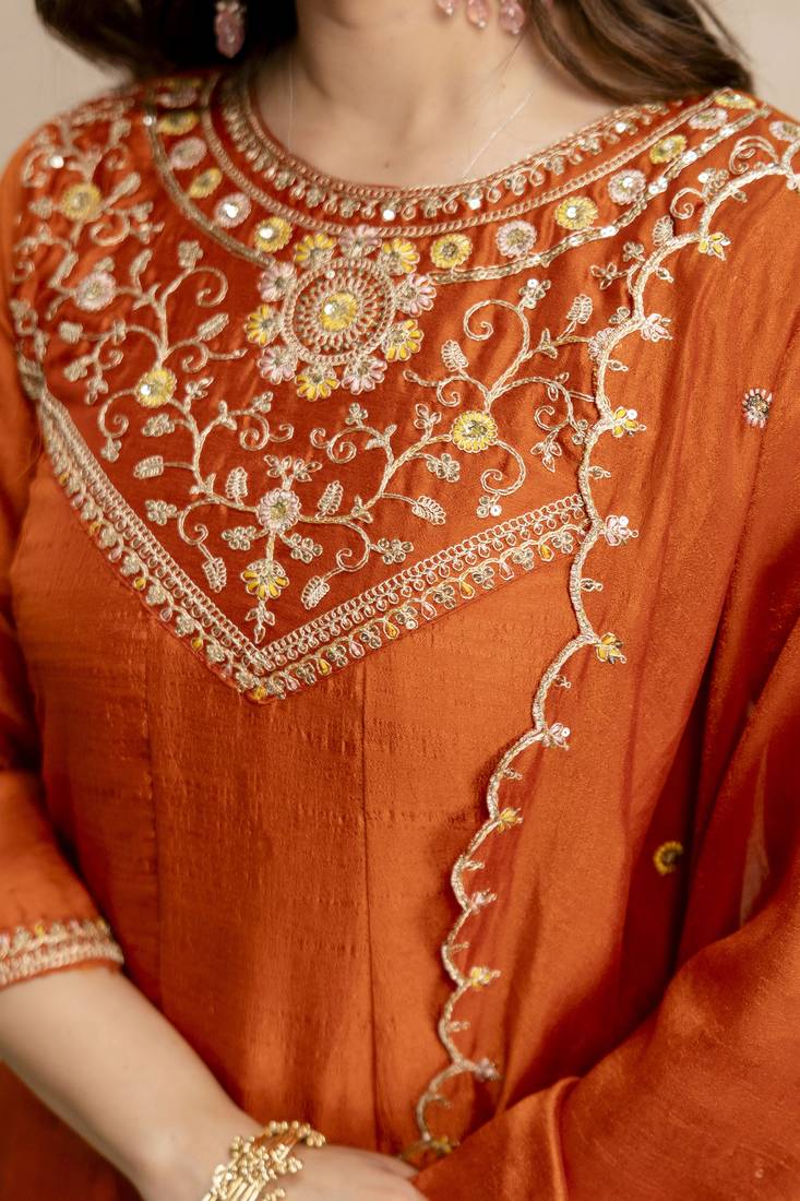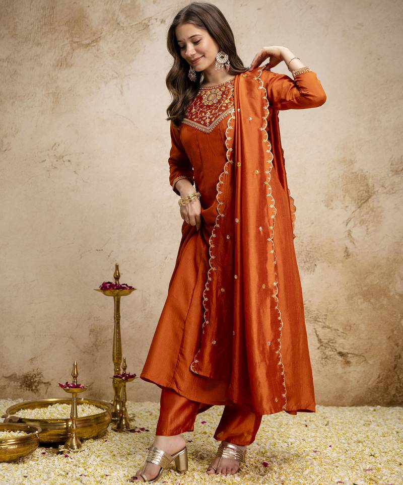 | Product Name | Orange Color Women’s Embroidered Vichitra Silk Anarkali Kurta Set With Dupatta – Flared Ethnic Suit For Festive | |