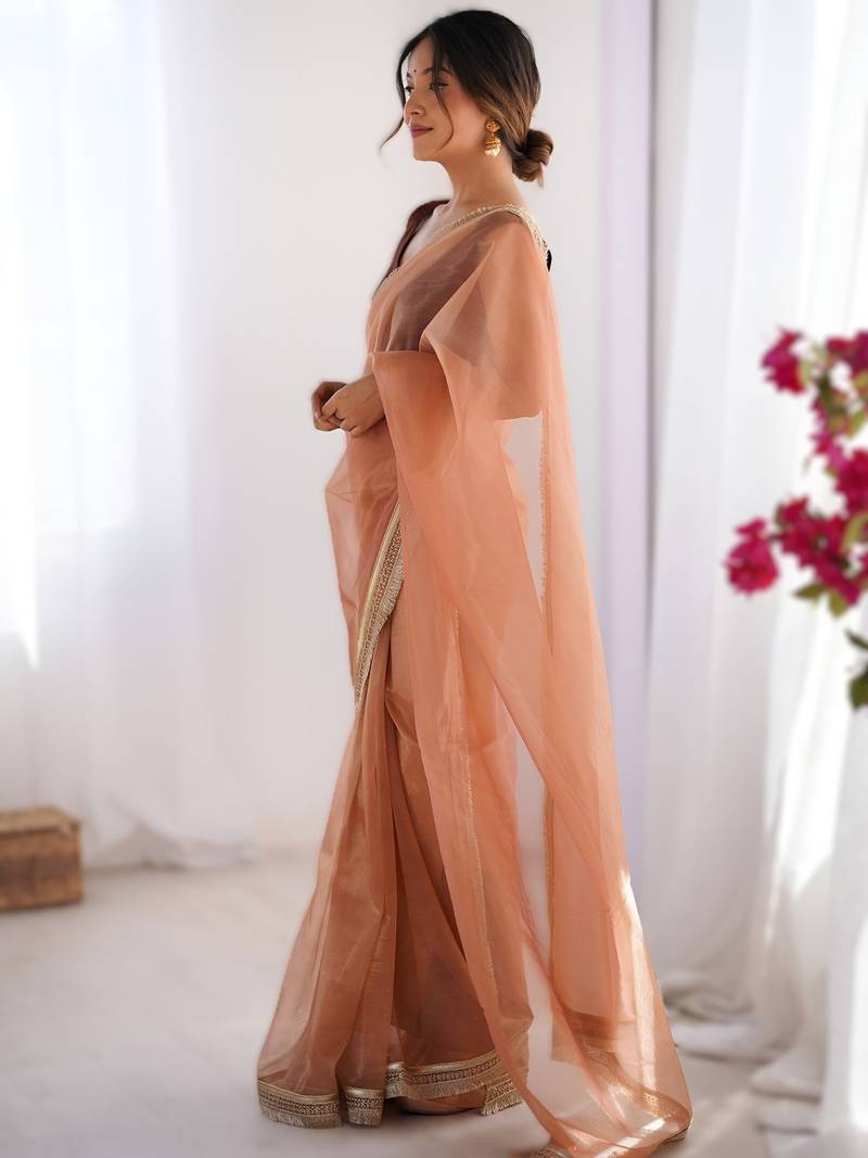Orange exclusive designer dual shade gold net sequins saree with lace border