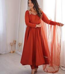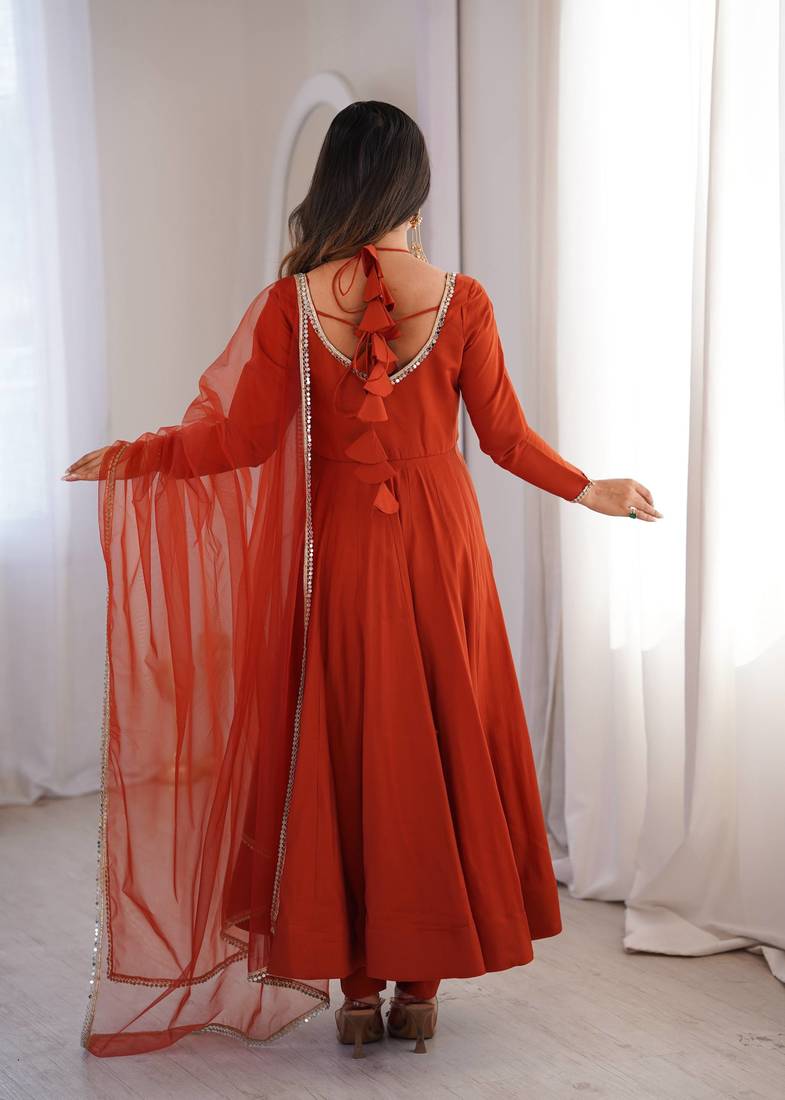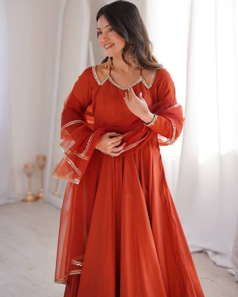 Product Name Orange Women Premium Romansilk Chanderi Anarkali With Microscrape Lining, Mirror Lace Dupatta & Matching Pant