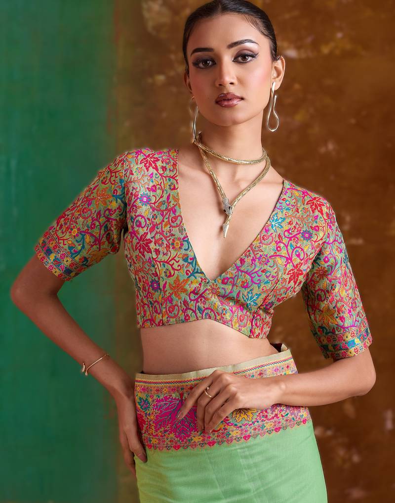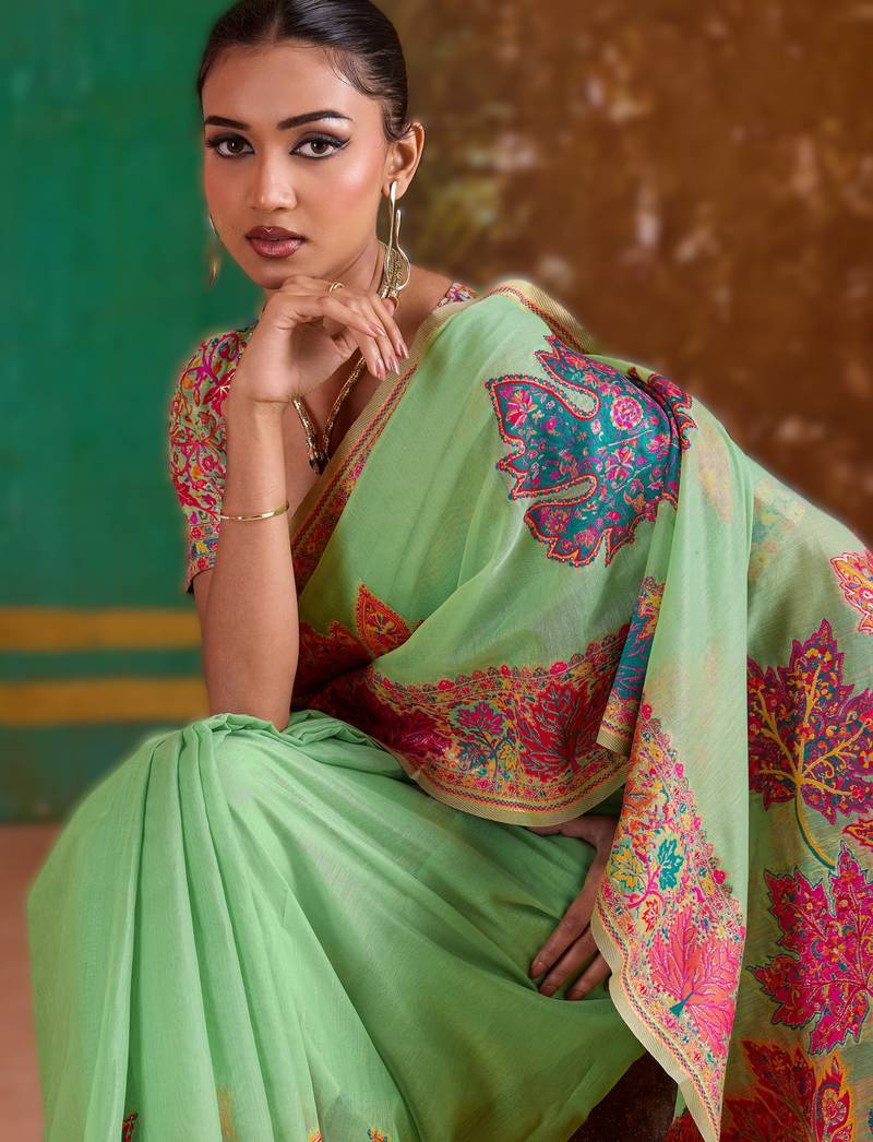 Parrot green modal cotton pashmina weaving saree – ready to dispatch