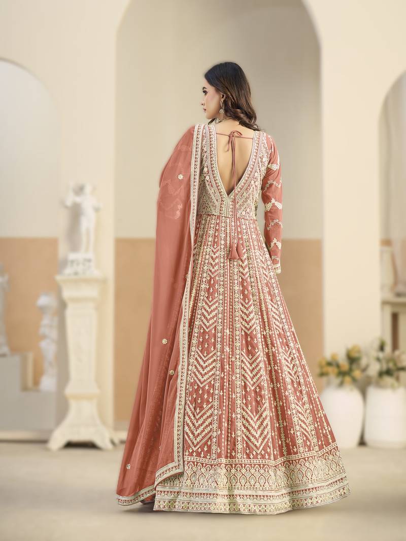 Peach georgette gown with santool bottom & dupatta semi stitched