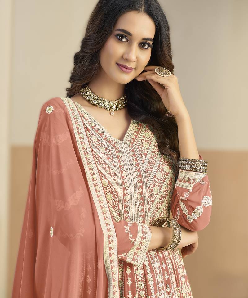 | • | Kameez | : | Color- Peach / Fabric- Faux Georgette |