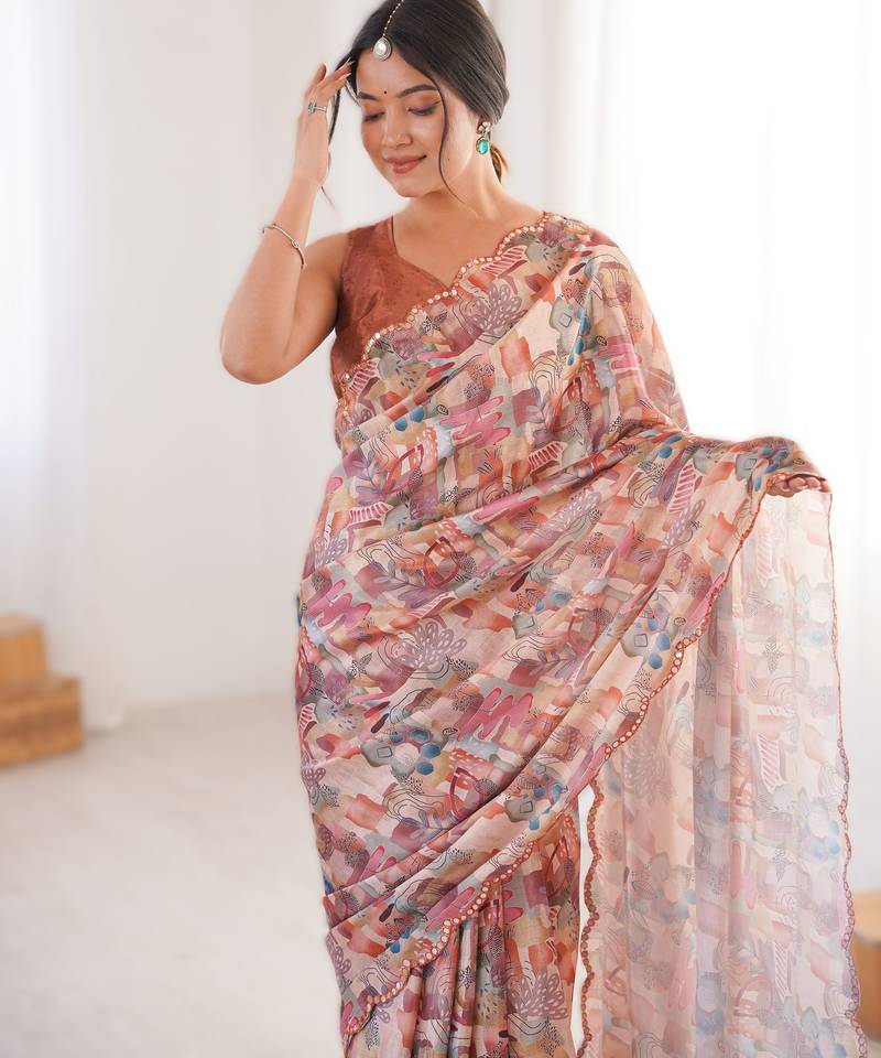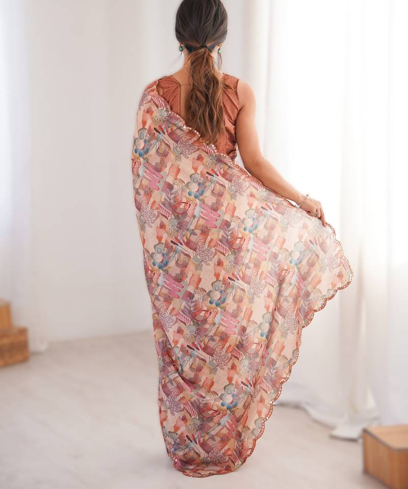 Peach heavy chinon printed saree with mirror work border