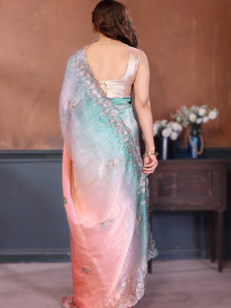 Product Name Peach Rich Gold Crush Silk Embroidered Saree With Multi Tone Color