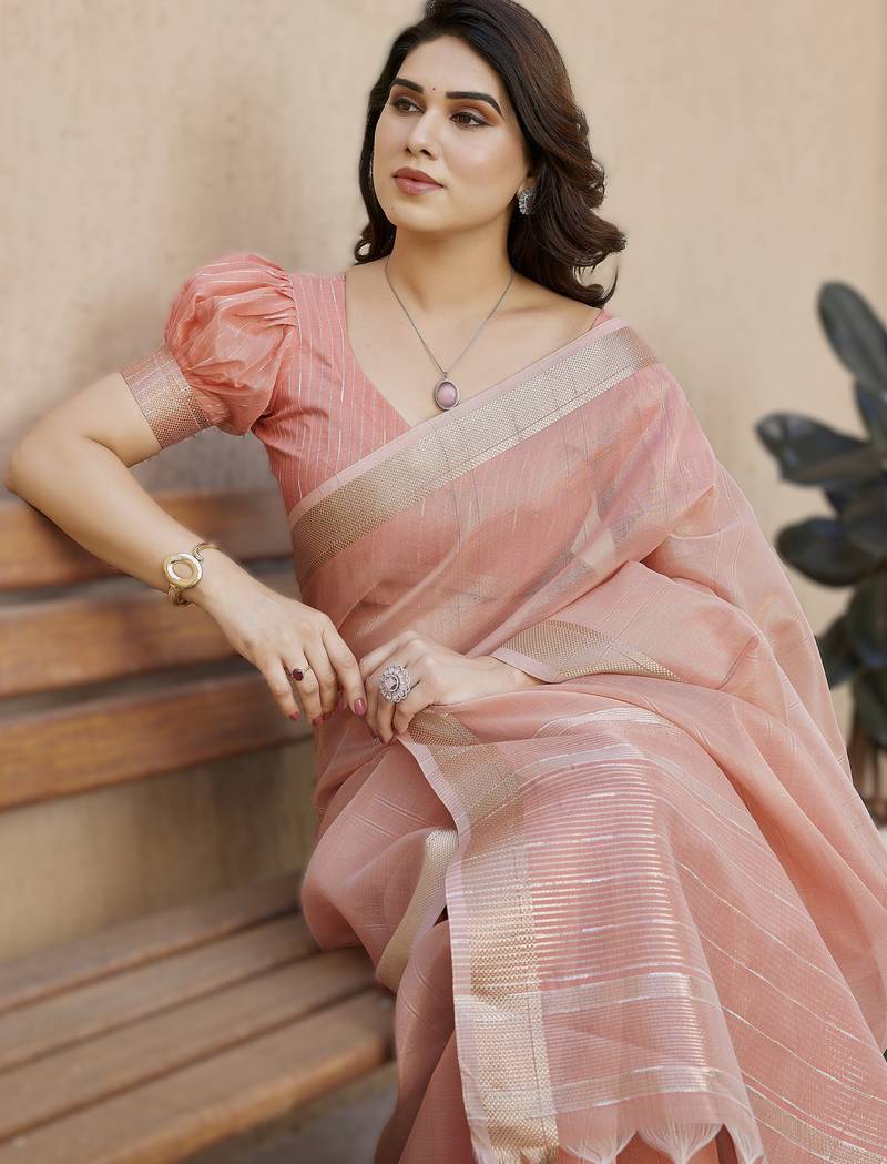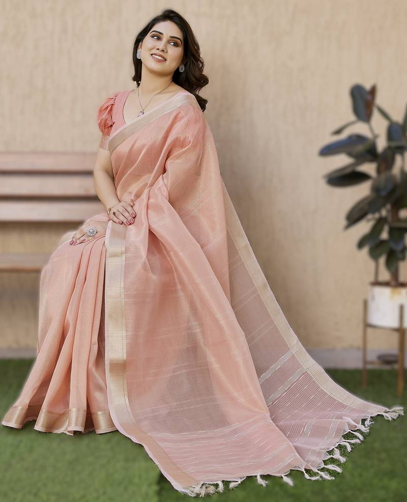 Peach soft tissue linen silk saree with all-over zari linings & rich zari pallu