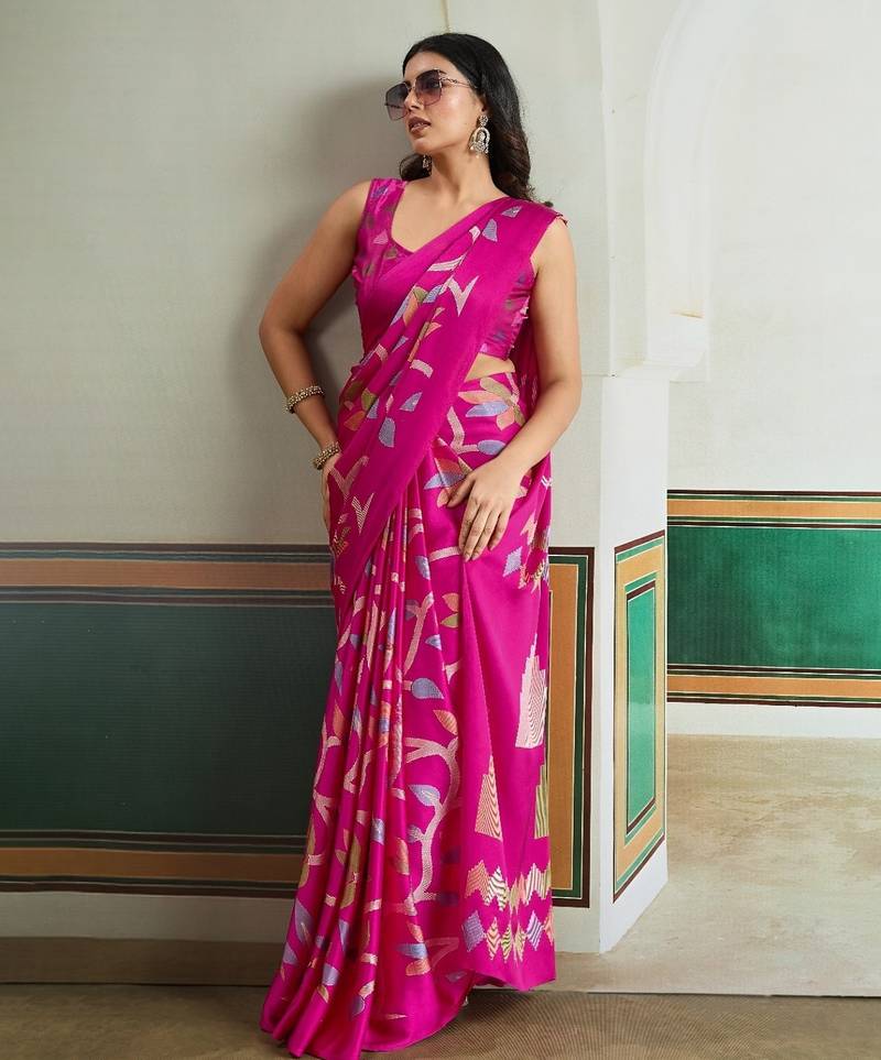 Pink color soft modal satin ajrakh print saree – timeless ethnic collection