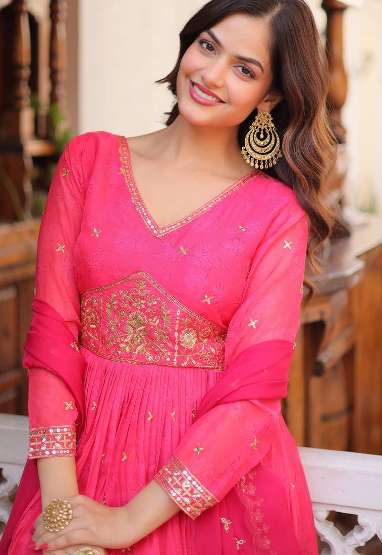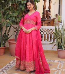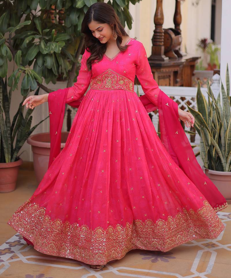 | Product Name | Pink Digital Printed Russian Silk Embroidered Gown With Dupatta – Zari & Sequins Work Festive Wear | |