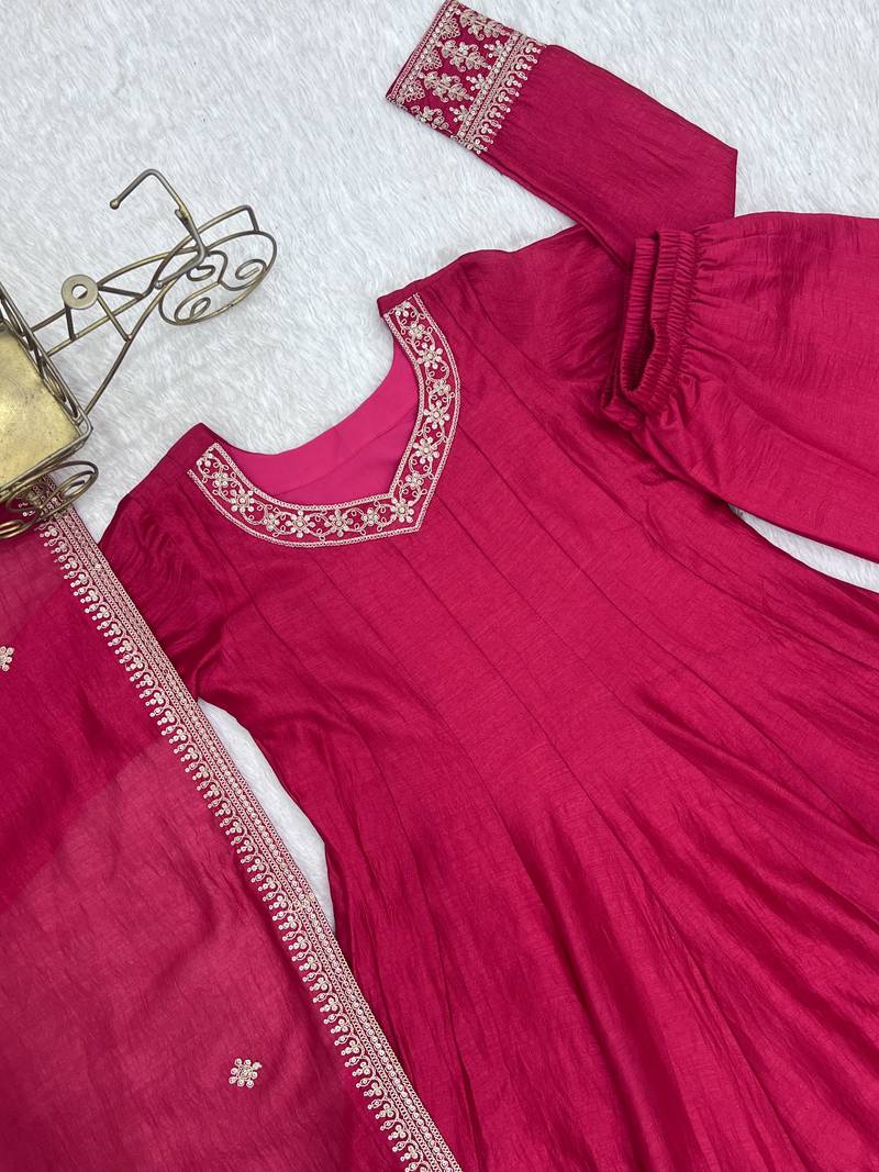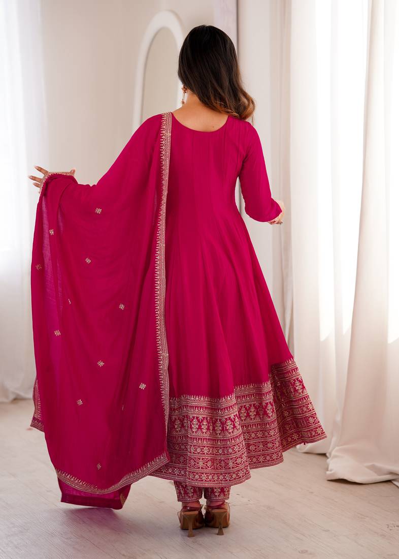 Pink heavy vichitra silk anarkali gown set with dupatta – full kali flare & embroidered work stitched