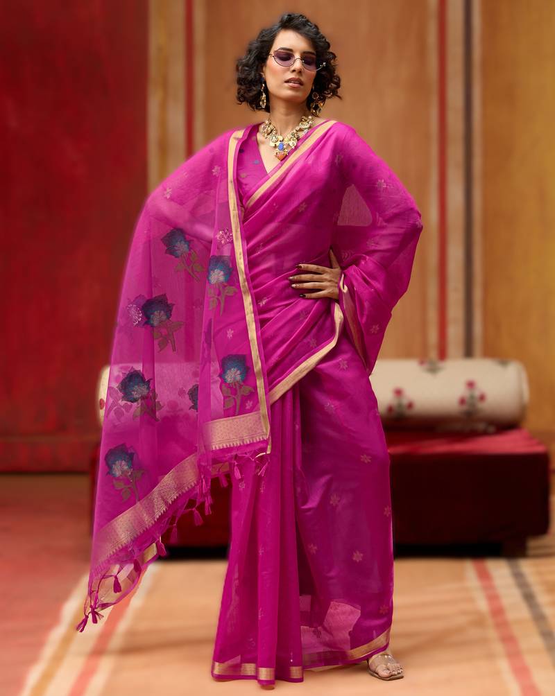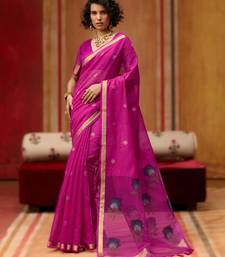 Pink munga cotton handloom saree with organza woven pallu party & uniform wear