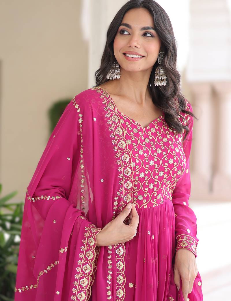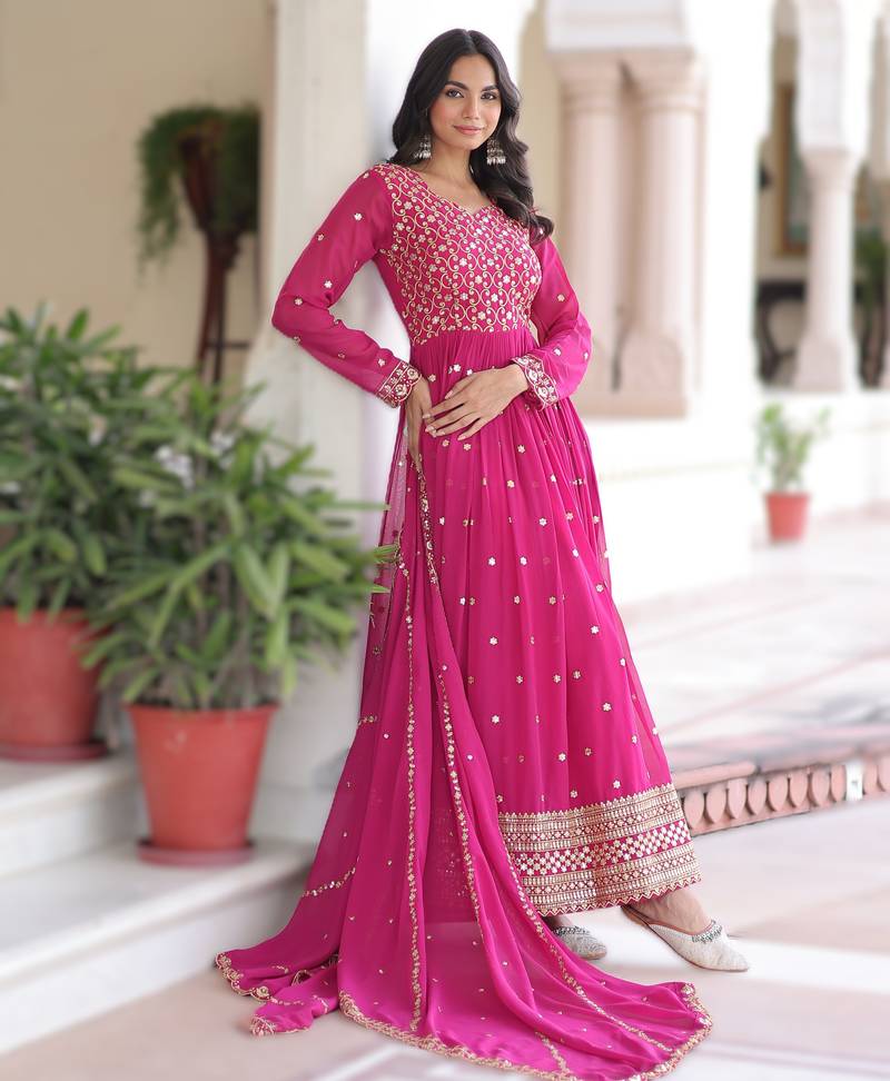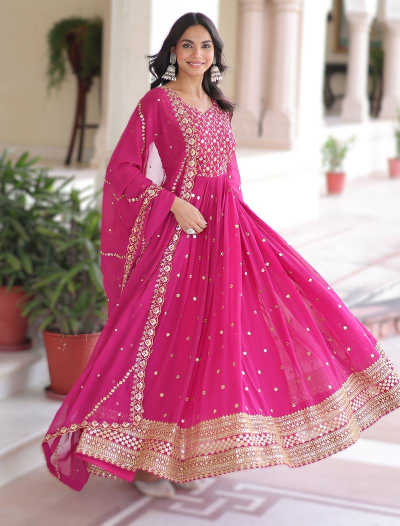 Pink faux georgette sequins & zari embroidered gown with dupatta stitched