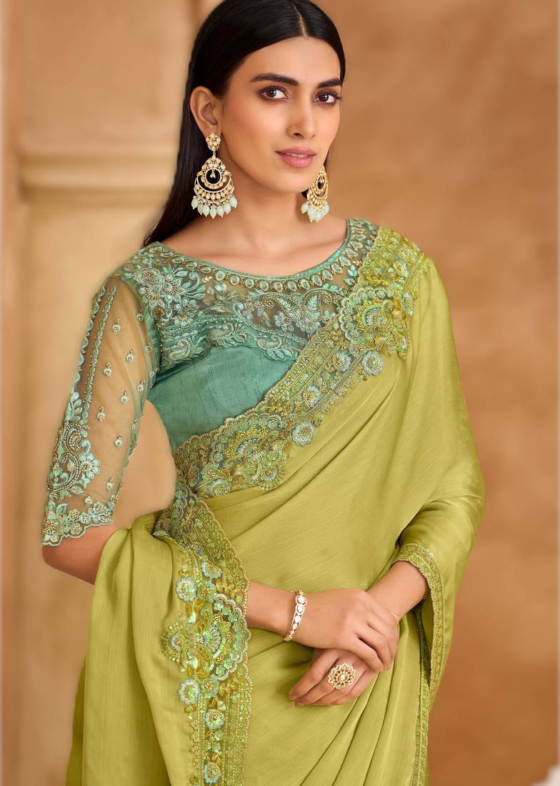 Pistachio green satin chiffon saree with banglori work blouse