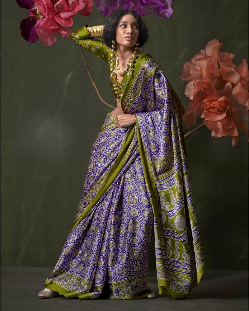 Printed ajrakh satin crepe saree – traditional art with a modern touch