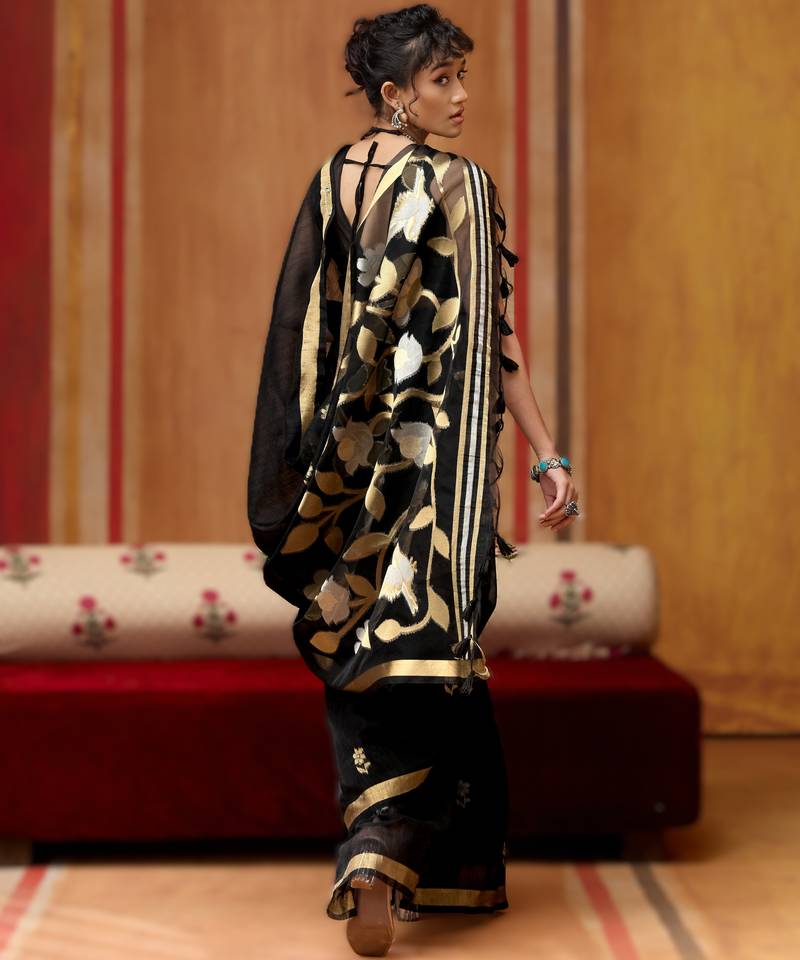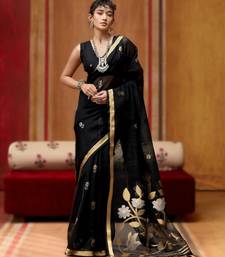 Black pure munga art silk handloom weaving saree with organza weaving pallu