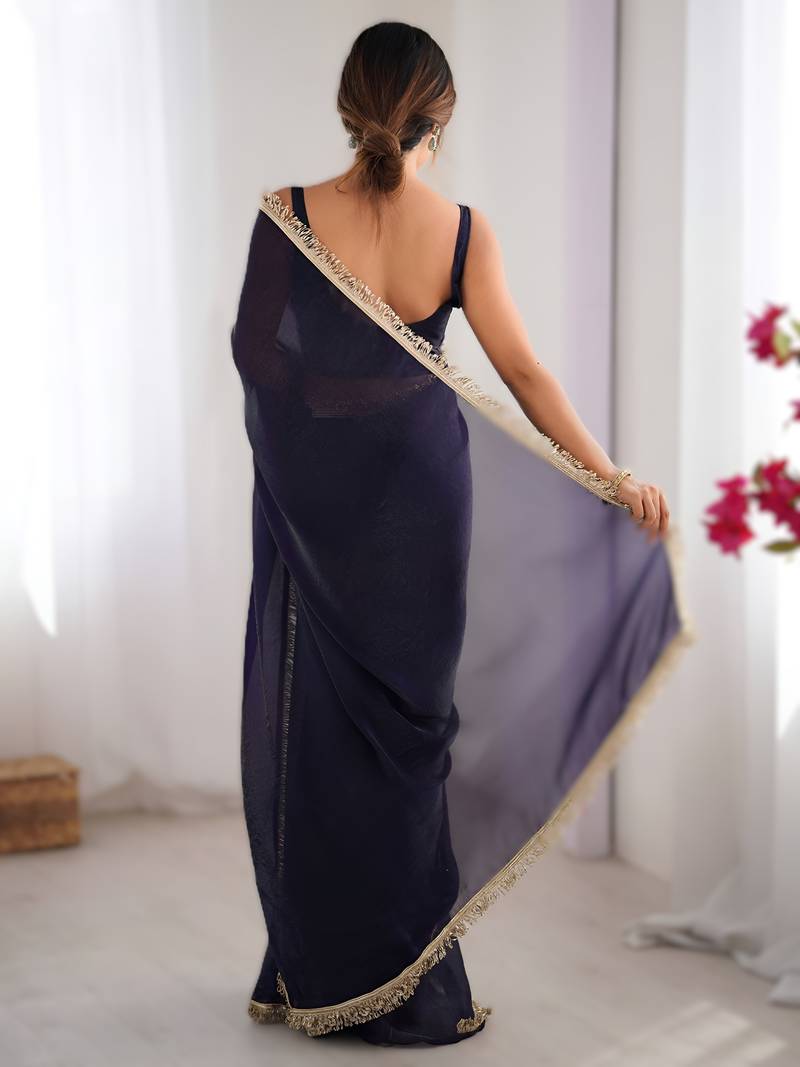 Navy blue soft space silk saree with sequin zalar lace border & matching blouse