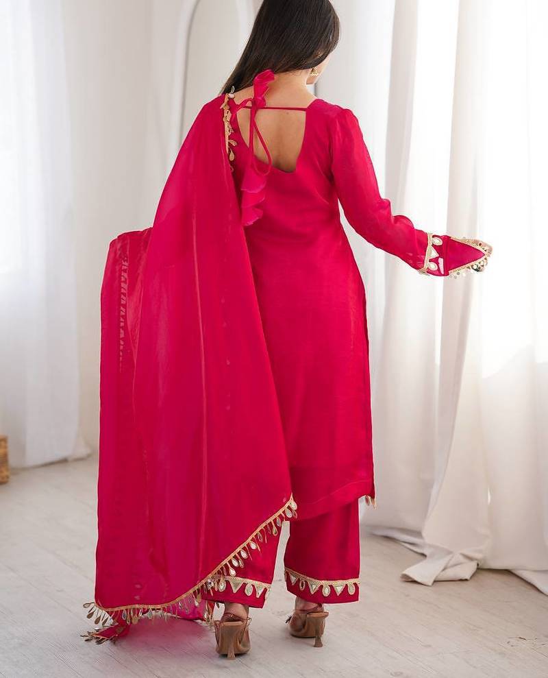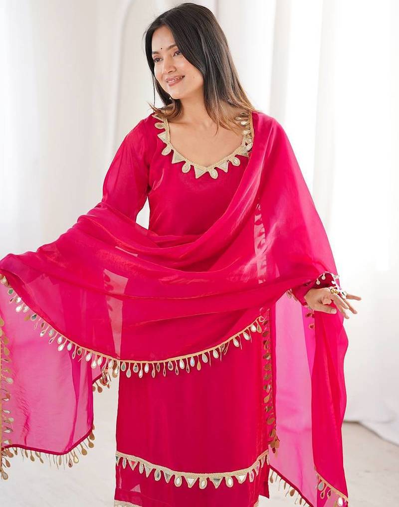 Rani pink women fendy silk mirror work top palazzo set with dupatta | fully stitched ethnic party wear